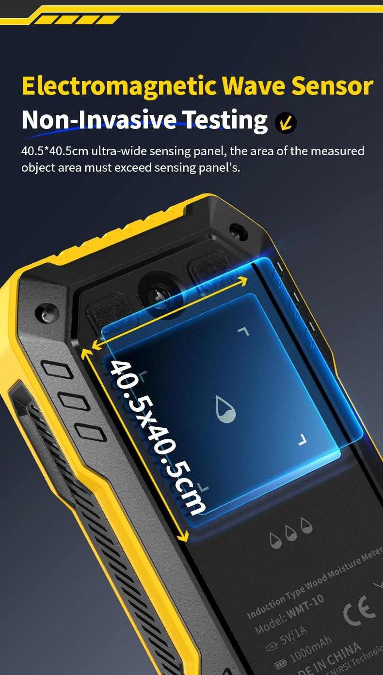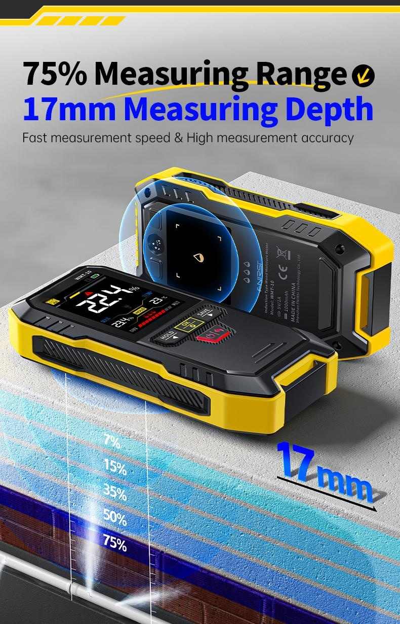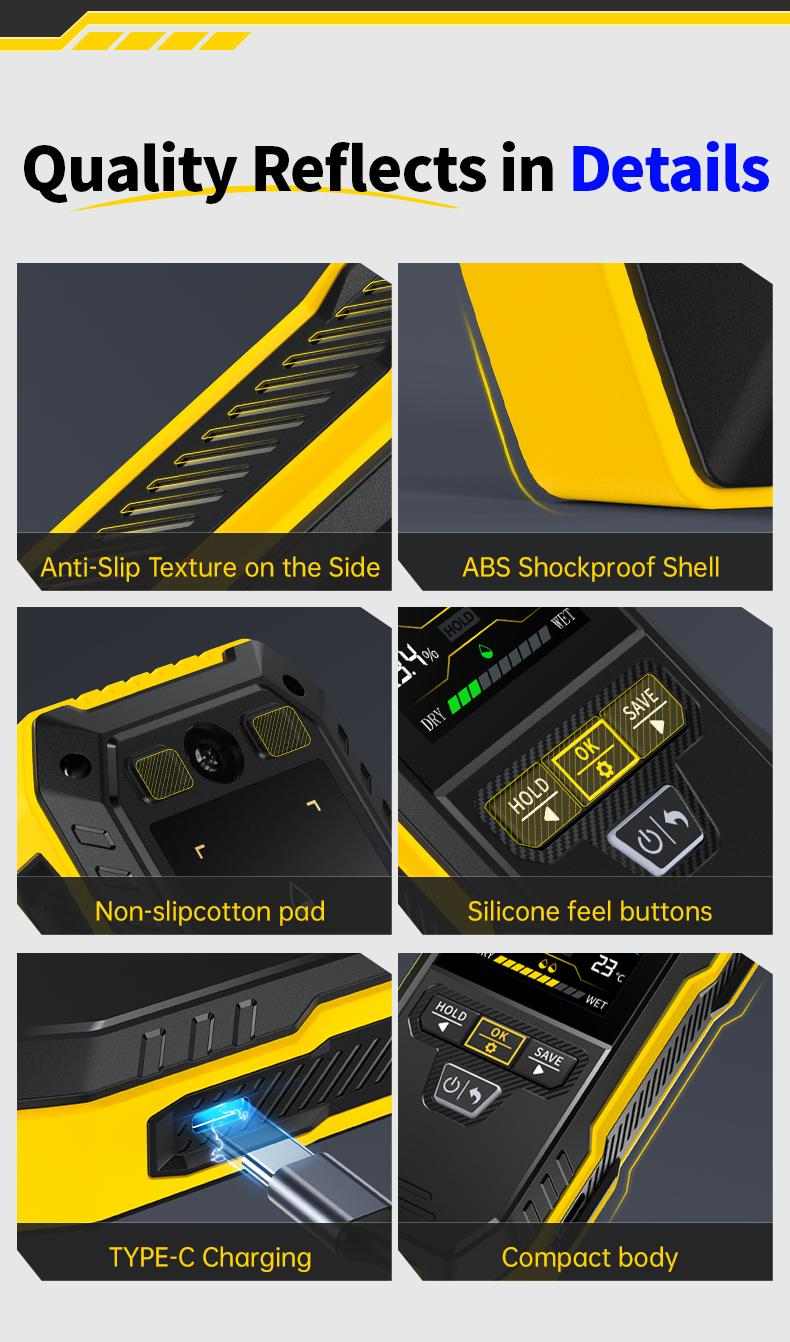 ✦Hochpräzise Messung: 0,1 % Auflösung und bis zu 17 mm Tiefe für genaue Feuchtigkeitsmessungen.